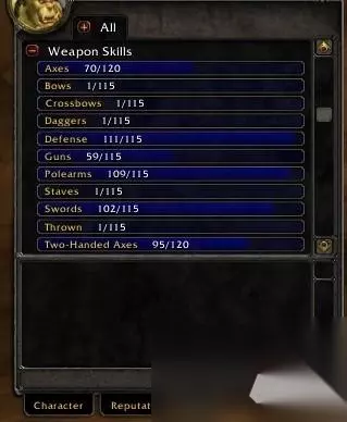 一、 什么是武器技能? 武器技能代表着你对某种武器的熟练程度,提升武器技能能提升你近战攻击的命中率。根据不同的职业和种族,所有的角色开始都会有固定的几种武器可以使用,之后可以通过武器大师训练学习其它武器。 注意:武器技能只影响近战的命中率。 1级的角色的武器技能等级上限为5,每升一级武器技能等级上限提升5,60级时武器技能等级上限为300。 一些物品和种族技能能提供额外的武器技能,例如兽人种族的斧头专精或世界掉落的剑师护手装备,并且能使武器技能等级上限超过300。 注意:除了长柄武器需要20级才能学习外,其它任何武器在任何等级时都能学习。