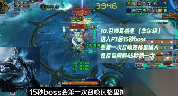 在P3阶段,团队策略至关重要。大团需提前分散,站于污染可能出现的位置静候指示。目标是将污染尽量控制在左半场。随着污染点名完成,全团迅速换边,准备迎接瓦格里发起的第三波抓人行动。这一阶段充满了抓人与灵活躲避污染的循环挑战。 在P4阶段,DPS团队凭借出色策略,成功在第4波抓人,将巫妖王推进40%的游戏进度。ATCH 二、技能介绍 1、寄生 "暗影契约"降临:对所有玩家施以暗影伤害,附加持续debuff。每秒的暗影伤害逐渐升级,直至生命值逾90%,寄生效果才会解除。此技能需在戒律指引下全团提前套盾配合。其余治疗则需共同努力,确保暗影契约的效果完美刷满。 2、召唤瓦格里 在台服翻译问题引起混乱后,许多团长习惯亲切地称呼他们的伙伴华尔琪。然而,随着P3版本的深入,15秒后那位狡猾的boss就会首次召唤瓦格里,对团队成员进行无情的抓取。瓦格里一旦出手,被抓的人将无法做出任何反应。更为恐怖的是,瓦格里会振翅向场外飞去,直至把人丢下悬崖,留给团队的只有无尽的追悔。因此,团队必须立即行动,尽快将瓦格里逼至50%以下的生命值,这样才有可能营救队友于水火之中。
