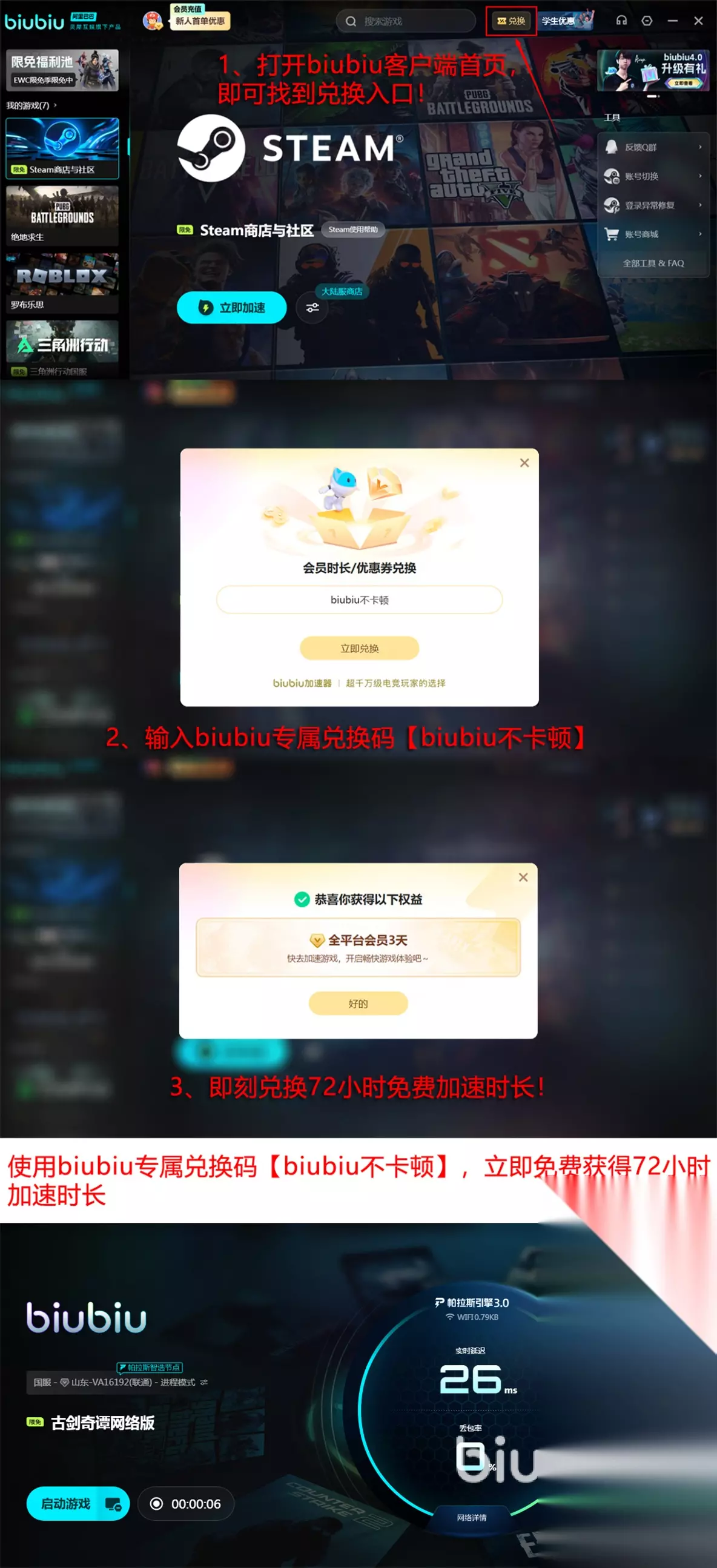 虽然biubiu采用的是付费会员制模式,不过对新注册账号直接送24小时加速时间,这样新号注册完毕后直接就能打开免费加速了。还推出了一个每个号都可以用一次的兑换码【biubiu不卡顿】,能够直接兑换72小时加速时间。新人有96小时免费加速时长可以享受到,当然就不用担心是否能够满足要求的问题了。