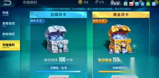 4.充值活动1.白银月卡,每日赠送100点券2.黄金月卡,每日赠送150点券+10钻石。