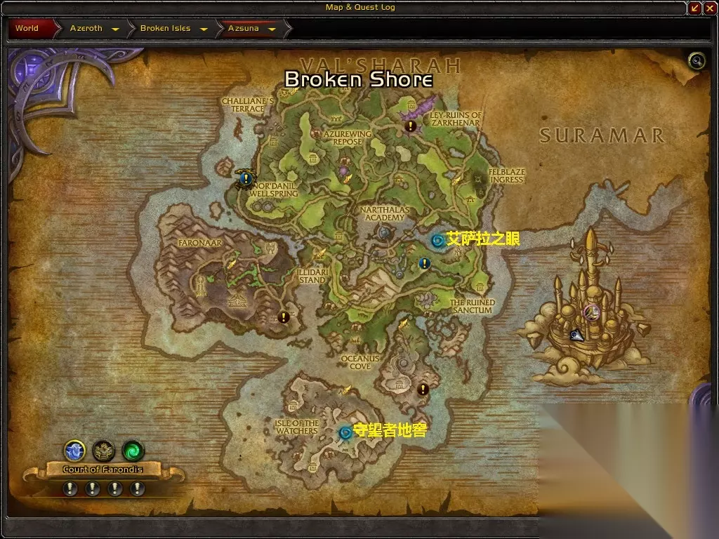 在游戏《魔兽世界》中,艾萨拉之眼的位置是在阿苏纳地图上的蓝色旋涡标记处。玩家可以通过水上行走药剂和用天蓝水黾坐骑这两种方法到蓝色旋涡标记处,即可找到副本艾萨拉之眼的进入位置了。