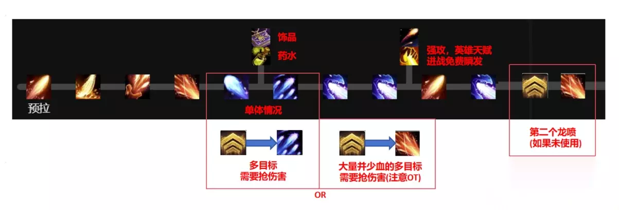 正常循环 正常循环单体和AOE并没有太大的变化,AOE时最好选择一个高血量的怪群体裂解让伤害最大化。技能优先级如下, 1.深呼吸 2.红喷 3.蓝喷 4.碎裂星辰,若精华迸发触发至2层优先先打消耗精华技能 5.群体裂解 6.裂解or葬火,精华迸发下 7.活体烈焰,已经有2层燃尽层数时(瞬发) 8.裂解or葬火,直到你没有精华 9.活体烈焰,直到你能打裂解