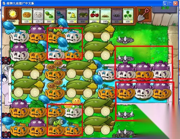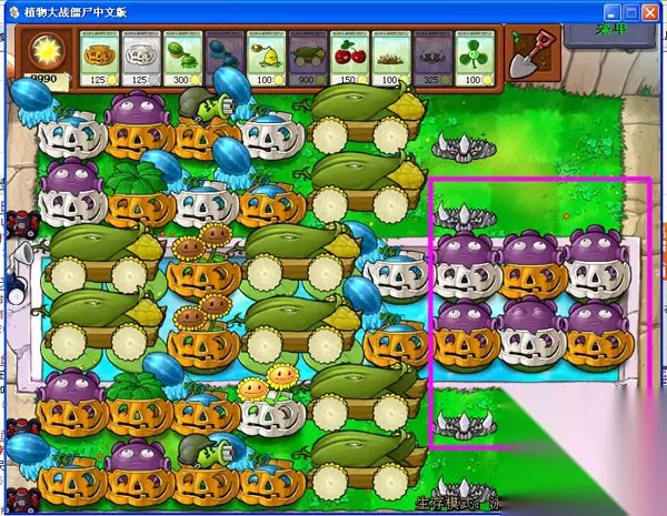 第二、冰西瓜的摆放;要确定几个西瓜的位置,保证每一行都有一个冰西瓜,能充分使僵尸减速,靠最边上的这一行可以多放一个西瓜,多放的冰西瓜的位置我认为放最后比较好,因为有植物伞的保护,不会被蹦极僵尸弄走。在最边上多放西瓜是因为这两行是喷菇所喷不到的,多加一个西瓜是为了增强这两行的攻击。这些西瓜放完后,前五轮基本都不用管,可以防的住。水路的西瓜放在第六个荷叶最合适,因为从水里钻出来的僵尸最前是在第六个,这就能挡住水里钻出来的僵尸,又能攻击到僵尸。
