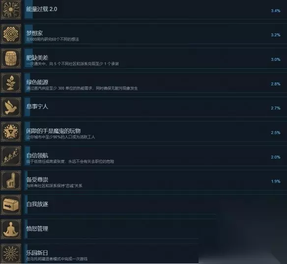 14、冰霜之城 条件:在一个地区应用至少5种不同的区域效果。 15、梦想家 条件:在600周内研究60个不同的想法。 16、肥缺美差 条件:一次通关中向5个不同社区和派系兑现至少1个承诺。 17、绿色能源 条件:通过蒸汽供应至少300单位热能需求,且保持无脏污状态。 18、闲散的手是魔鬼的玩物 条件:让城市中至少90%的人口成为活跃工人。
