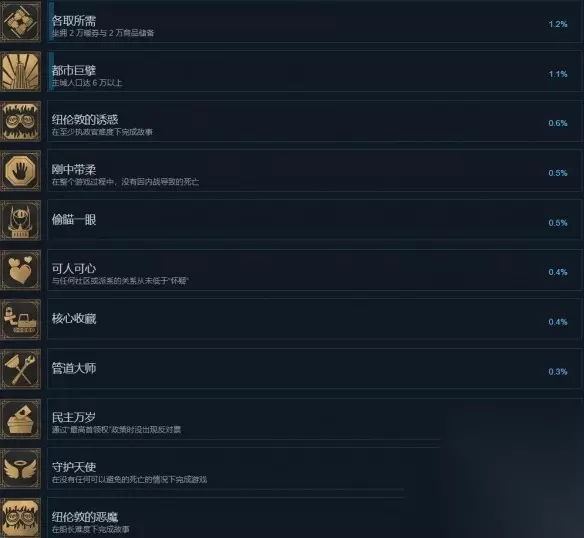 19、自信领航 条件:由于低信任或高紧张度,永远不会有失去职位的风险。 20、备受尊崇 条件:与所有社区和派系保持“忠诚”关系。 21、乐园新日 条件:在乌托邦建造者模式中完成一次游戏。 22、各取所需 条件:拥有2万热券与2万商品储备。 23、都市巨擘 条件:主城人口达到6万以上。