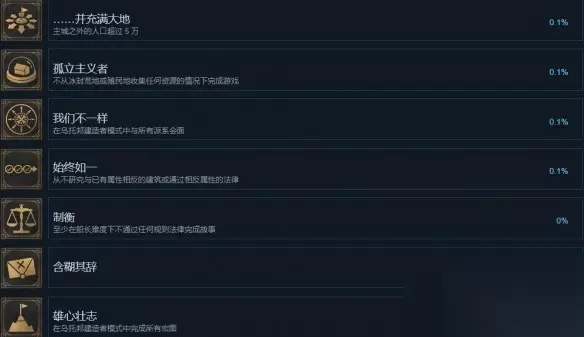 32、我们不一样 条件:在乌托邦建造者模式中与所有派系会面。 33、始终如一 条件:从不研究与已有属性相反的建筑或通过相反属性的法律。 34、制衡 条件:在船长难度下不通过任何规则法律完成故事。 35、雄心壮志 条件:在乌托邦建造者模式中完成所有宏图。