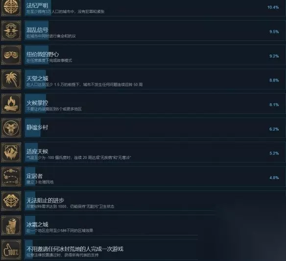 6、法纪严明 条件:在至少拥有3万人口的城市中,保持无犯罪和紧张状态。 7、混乱信号 条件:在城市中同时发生集会和抗议。 8、纽伦敦的野心 条件:在任意难度下完成故事模式。 9、天堂之城 条件:在城市人口达到1.5万的情况下,连续50周无任何问题运行。 10、火候掌控 条件:避免内战蔓延到5个或更多地区。 11、适应天候 条件:气温至少达到-100摄氏度时,连续20周实现“无疾病”和“无寒冷”。 12、定居者 条件:建立3处殖民地。 13、无法阻止的进步 条件:即使材料需求达到1000,仍能保持“无脏污”卫生状态。
