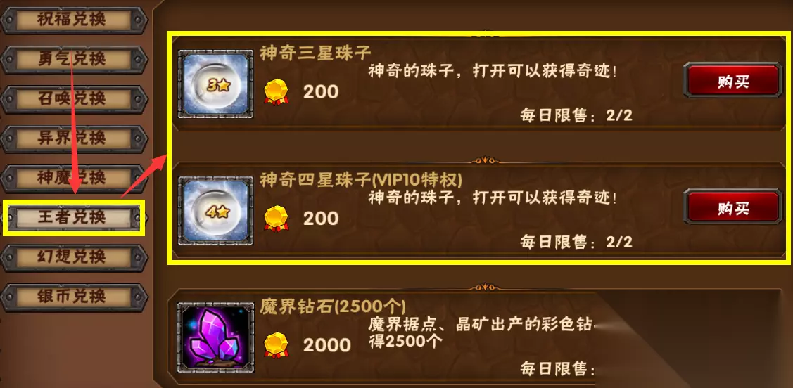 【王者兑换】,主要兑换龙珠以及幻想装备宝箱碎片 (通过王者门获取兑换资源) 王者门位于:英雄之门——王者之门(每4天开放一次)