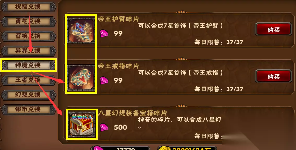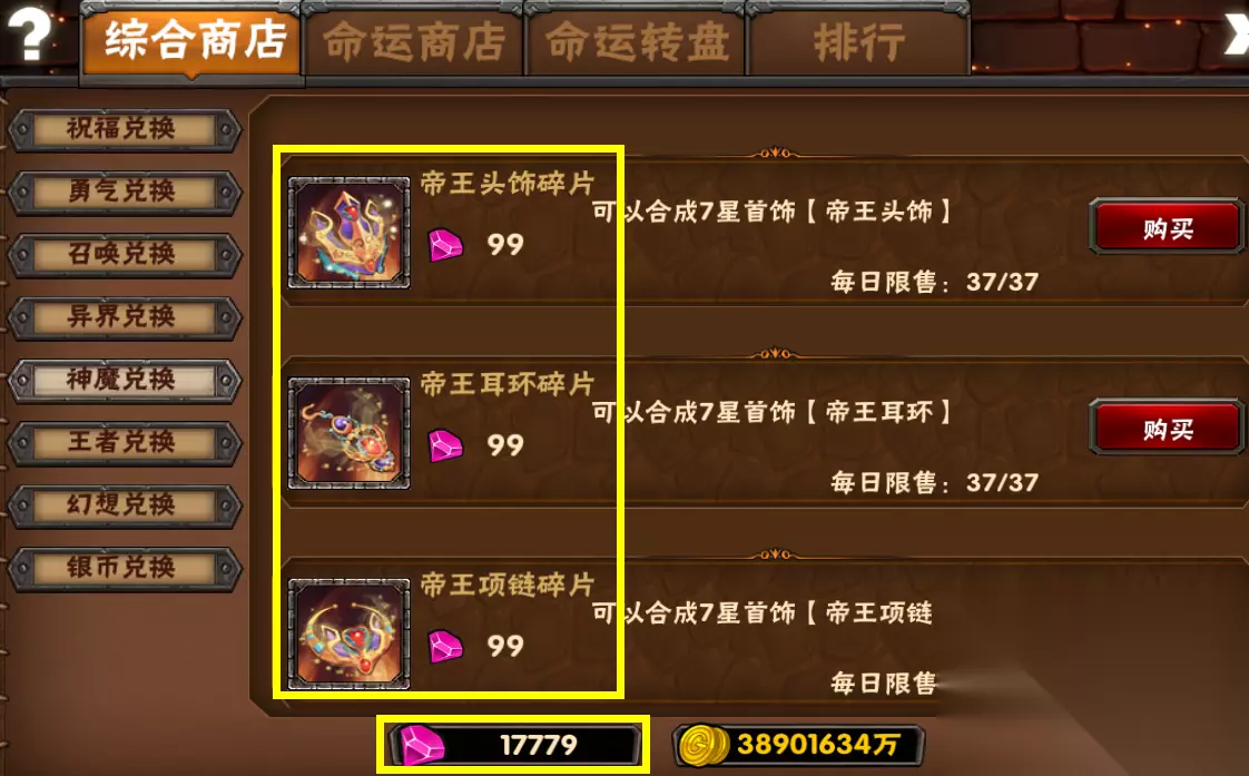 【神魔兑换】,帝王首饰碎片以及幻想装备宝箱碎片 首饰的主要来源,可以节省大量命运礼券,幻想装备就不说了,毕业装备,必买!!! (通过神魔塔获取兑换资源)