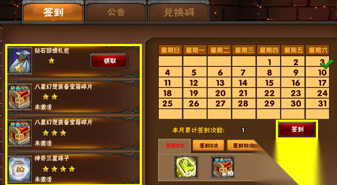 领取的奖励多少受声望值影响,声望越高奖励越多 截至2024年8月5日为止,最高奖励是[290钻石+8600万金币],需要声望值:4.61亿 2.签到奖励+在线奖励 于每日福利中签到(兑换码也在这里使用)