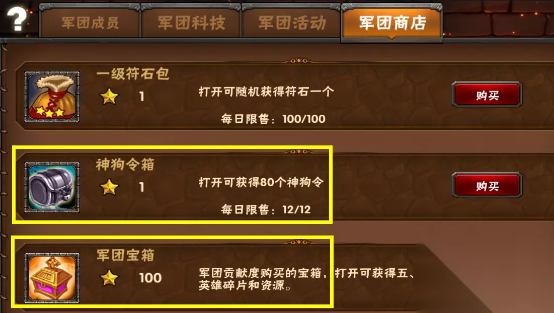 然后就是军团商店 每日买神狗令箱 其中军团宝箱是神狗令牌的主要获取渠道(军团15级可购买)