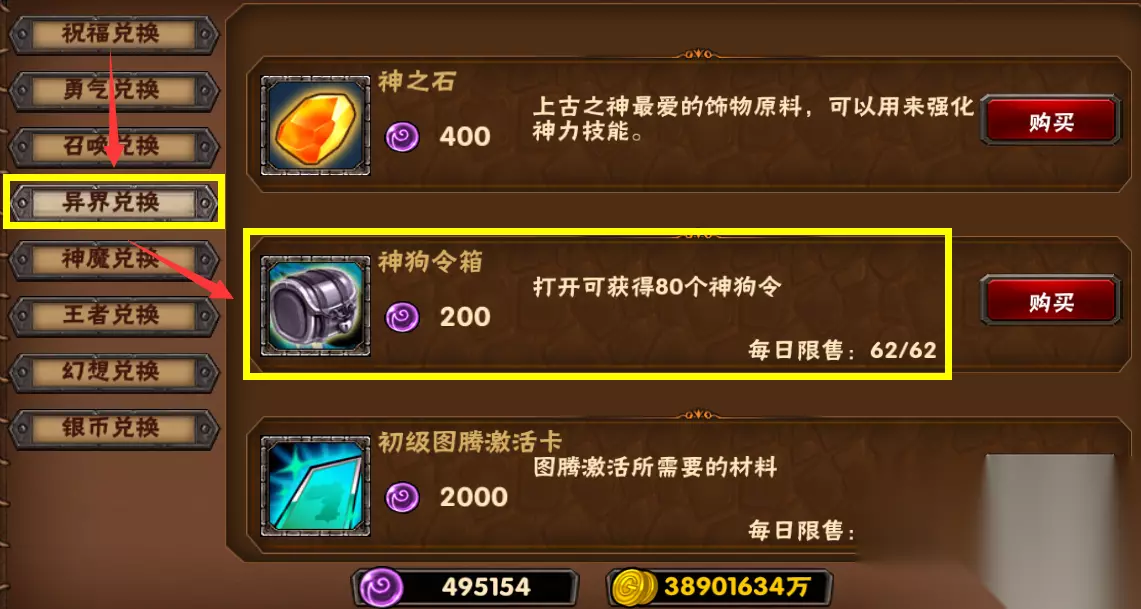 幸运商店每日需要兑换的东西: 【异界兑换】,神狗令箱 缺神狗令的记得换,换一点是一点 (通过异界之门捐献获取兑换资源)