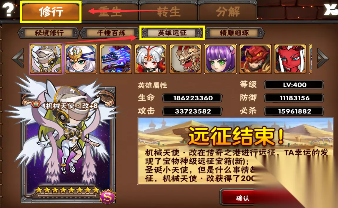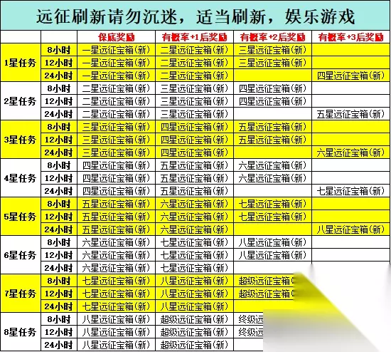 放入任意英雄即可开始远征,等结束后领取奖励即可 提示:钻石刷新出高星的概率更高 适度刷新,切勿上头!!! 适度刷新,切勿上头!!! 适度刷新,切勿上头!!! vip等级越高,可解锁的位置越多! 远征奖励表格如下: