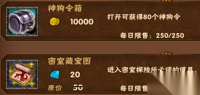 然后是神狗令箱(缺神狗必买) 藏宝图建议买,可以跑密室购买龙珠以及通关获取觉醒丹(可以提前买存着,有空再跑) 佛系玩家的话不买藏宝图也无所谓!