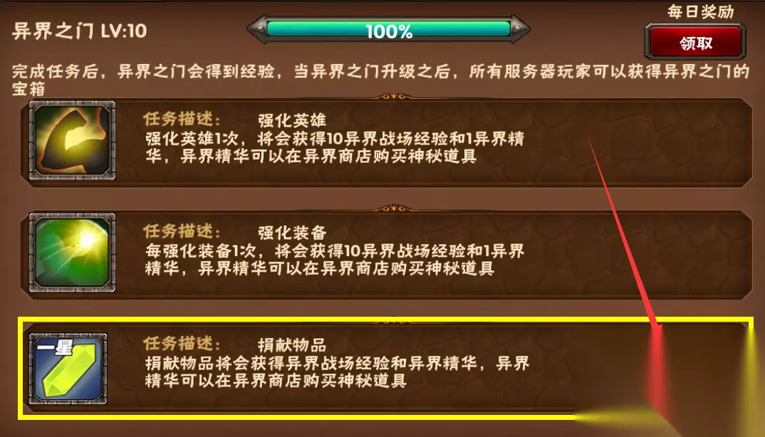 根据本服异界之门等级的提升会增加每日奖励(捐献道具可以增加异界之门经验值) 注:捐献不是每天都可以捐献的,有时候不能捐献
