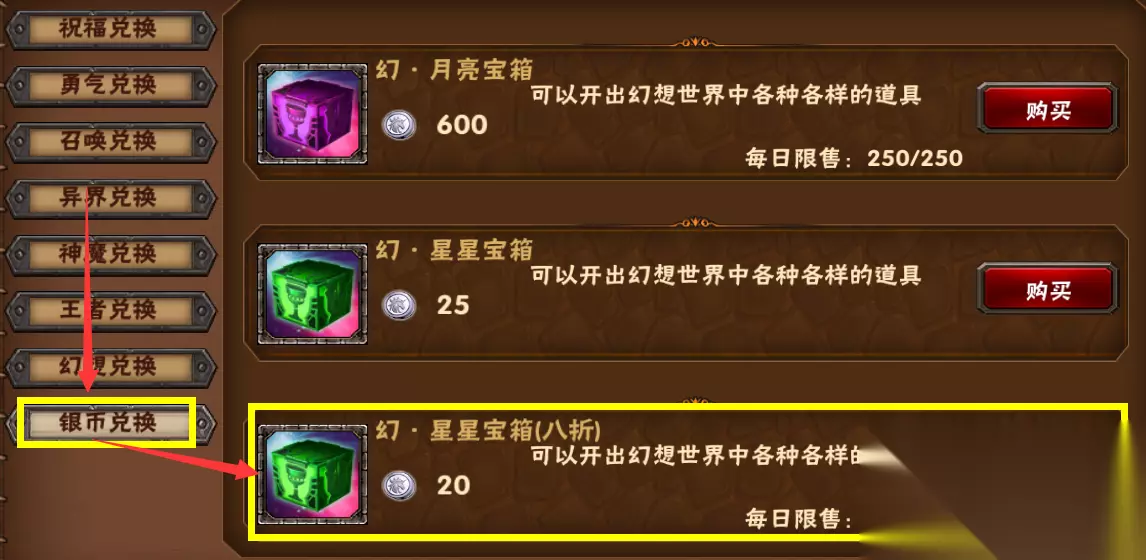 【银币兑换】,每日限量折扣幻·星星宝箱,一定要换! 同样的,兑换数量也受vip等级影响! (主要通过幻想试炼击杀boss获得兑换资源,其中远征、大活动等也可获取一定的数量)
