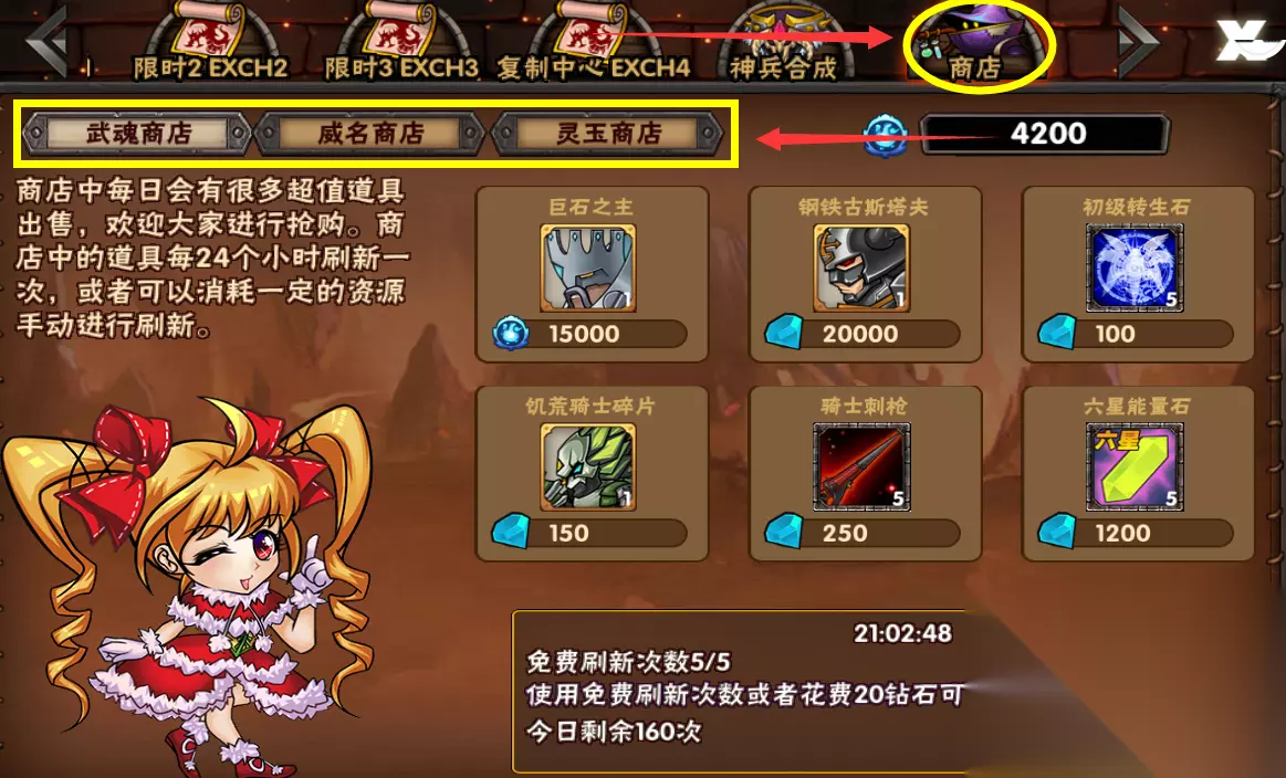 每日5次战斗次数 如果主角专属武器和头盔还没凑齐,或者还没ex的,建议每天买满次数 4.神魔塔