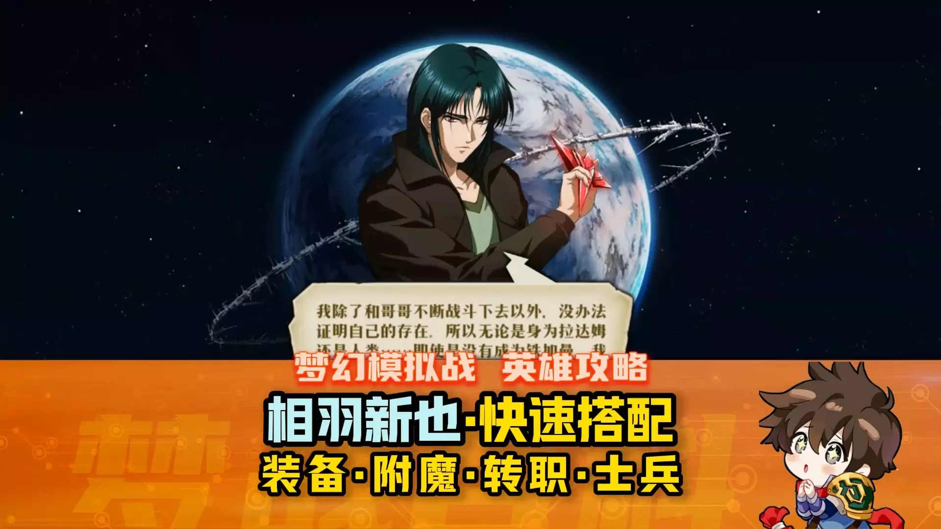 这是战棋游戏《梦幻模拟战》和宇宙骑士联动的英雄讲解内容,第1集聚焦SSR英雄相羽新也,对其自动二连击机制、职业、天赋、技能等进行了详细讲解,助力玩家掌握该英雄的战斗特点。