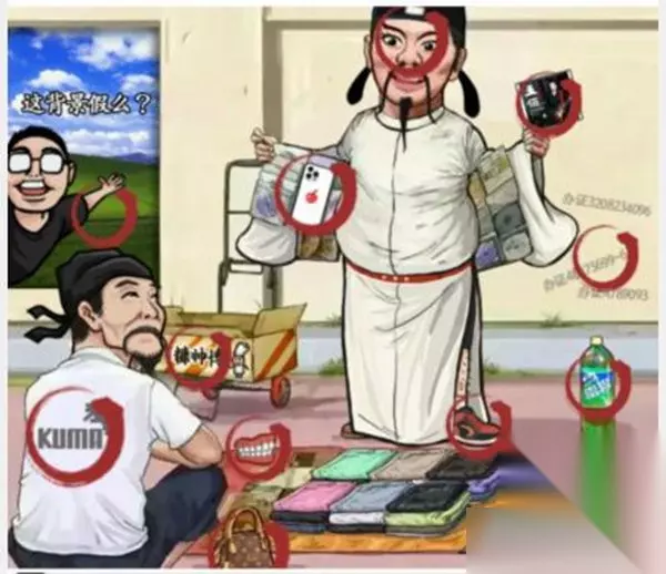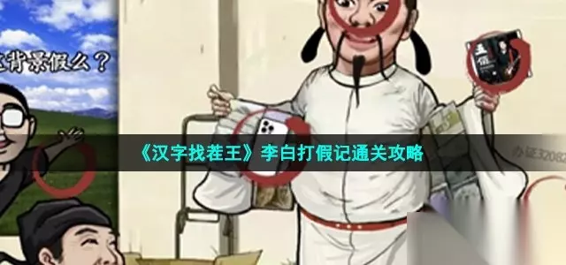《汉字找茬王》李白打假记通关攻略 关卡任务:找出图中12个假货 樱桃手机 背景 唱片 杜甫的T恤、 雷碧 唐诗七百首 LU包 糠师傅 球鞋 证件 假牙 李白的假睫毛