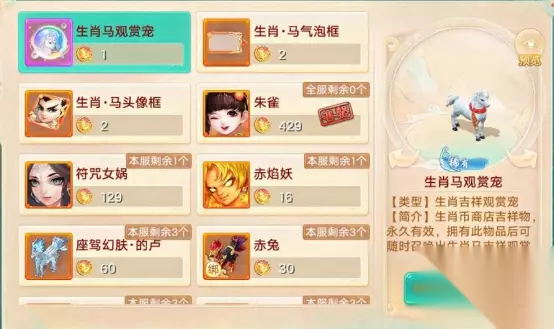 马年生肖纪念币全服限量产9999枚(其中《生肖·马》产3333枚,为最主要产出服务器)。全服少侠每日达到125活跃即可获得生肖矿镐,有几率挖到生肖币。生肖币可跨服摆摊各服之间自由流通,价值极高,作用丰富: 1)兑换:生肖币可以兑换生肖马主题限定外观、珍稀神兽、马主题座驾、马主题时装、龙马凝神丹、元气丹、幻肤丹、高宝图等20多类稀有物品;