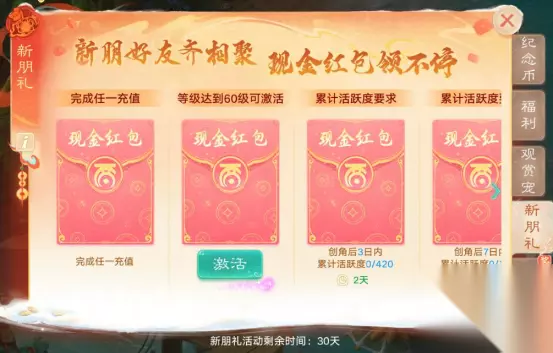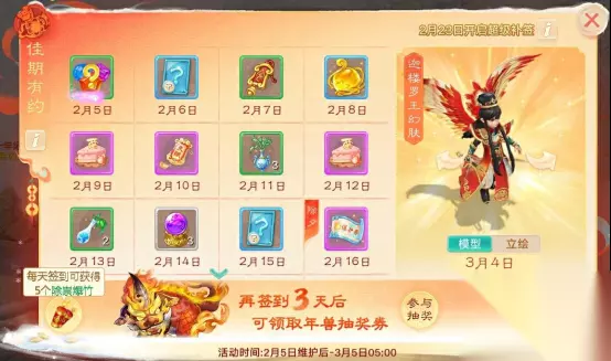 佳期有约,新春献礼!签到领幻肤,转盘赢豪礼,共庆团圆年! 活动时间:2月5日维护后-3月5日5:00 1)活动期间每日可签到领取奖励,福糕,聚魄丹等豪礼送不停,完成3月4日签到必得迦楼罗王·天宫马倌! 2)2月23日起每日最多可以进行4次补签,多次补签需要消耗少量银两。 3)每累计签到三次可获取一张神兽抽奖券·锁,2月24日5点后可消耗666666银两解锁,3月3日可参与抽取神兽大奖,若未抽中大奖银两全额返还! 新年除祟