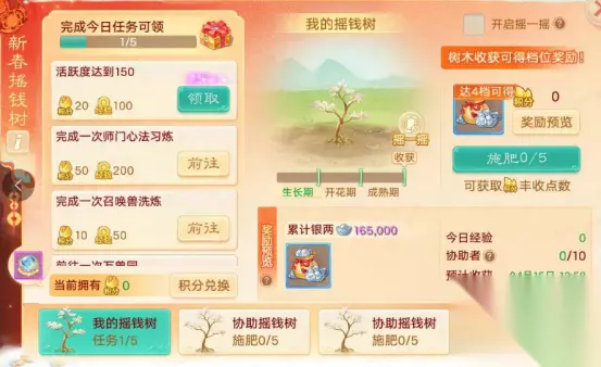 摇钱树下招财进宝,新春时节喜气盈门。 活动时间:2月24日5点~3月3日5点 1)活动期间少侠可参与新春摇钱树玩法,种植摇钱树或协助他人种植,完成摇钱树养成后可获得丰厚银两奖励! 2)种植摇钱树需要拥有摇钱树树苗,摇钱树树苗可通过情谊积分兑换,回流少侠将自动拥有树苗。 3)情谊积分可通过:每日活跃度奖励,摇钱树玩法任务,邀请回流少侠获取。情谊积分还可用于兑换聚魄丹,龙之骨等精美奖励! 新春赏金 新春玩新服,新服送现金!进入新服,领取少侠你的新春现金红包。
