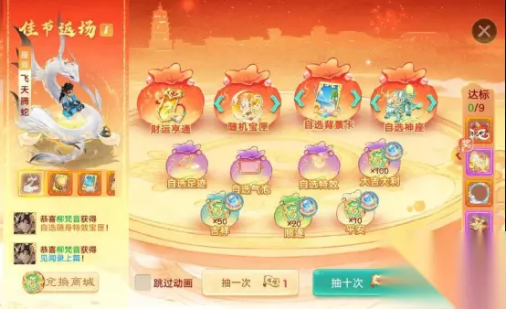 1)使用神秘画卷参与活动,每张神秘画卷可以随机翻出一种图案——包含9种普通卡面和1张金卡,铺满九宫格即可开奖; 2)翻出相同卡面可以触发对对碰、三连碰、四连碰、六连碰等获得对应奖励,若包含全部的九张普通卡面即可触发全家福!每次奖励都会返还一定数量的神秘画卷(绑),幸运碰不停! 3)触发消除并获取奖励时,未结算消除的卡牌将会保留在场上; 4)少侠可自选一张卡牌作为幸运卡(在活动期间可随时更换),抽到幸运卡时获得一次幸运奖励,幸运卡发奖时不会消除; 5)翻出珍贵的金卡可能获得马年新春限定外观,珍稀幻肤年·乾元启明、永·天子八骏、龙马全阶幻肤丹——一颗即可解锁三个阶段对应的龙马幻肤外观,单人座驾马上来财、座驾幻肤金马满堂、时装大漠镖客等; 6)部分外观奖励可在活动中分解为对对碰积分——可用于在活动商店中兑换心仪的外观大奖或养成道具! 7)在新春对对碰中获得永·天子八骏、龙马全阶幻肤丹、单人座驾马上来财、座驾幻肤金马满堂时,可解锁绝代风华八骏图中对应形象的收集项; 佳节返场