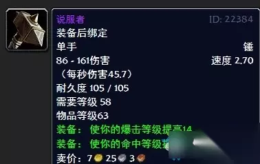 魔兽世界怀旧服说服者属性介绍 物品等级 63 装备后绑定 主手 锤 86 - 161 伤害 速度 2.70 ( 每秒伤害 45.7 ) 耐久度 105 / 105 需要等级 58 装备:使你击中目标的几率提高1%。 装备:使你造成致命一击的几率提高1%。 学习自:由图纸说服者学习,图纸由各大副本的小怪和boss掉落。