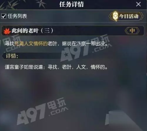 此间的老叶这个任务一共有三种,分别是感慨宋辽战争的老叶、体重下降最快的老叶,以及充满人文情怀的老叶,这三个NPC的位置都是不一样的。 位置在宋辽边境,大家可以直接在人物寻路那里输入老叶自动寻找,也可以直接输入坐标(436、335)。 位置在杭州,同样可以直接搜索人物,不过这个老叶是会走动的,玩家可以先屏蔽周围的玩家,在旁边多找一下。 另外这个老叶是无法直接对话的,玩家要先使用望气技能,选中老叶后再洞悉,就能触发后面的任务了。 位置在汴京,同样打开自动寻路搜索老叶就可以了,或者直接输入坐标(773、783)。这个老叶不需要用望气技能,直接对话就能完成任务。 以上就是的全部内容了,更多游戏攻略请点击。