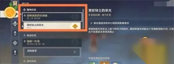 黑蛇骑士的荣光是原神手游3.0版本中的一个新增任务,那么原神黑蛇骑士的荣光在哪里接取?下面小编为各位整理出,希望可以帮助到你。 1、玩家前往无名遗迹; 2、使用层岩巨渊地下矿区传送锚点传送; 3、玩家需要找到紫雾,并前往; 4、触碰紫色的雾就进入到了遗迹顶层中间的房间,前往发光的地方; 5、走剧情,看动画之后就回到黑蛇骑士的荣光。 原神须弥活动需要完成魔神任务黑蛇骑士的荣光之后才能游玩。 黑蛇骑士的荣光是回响渊底的安魂曲第二章第四幕的最后一个任务 冒险等阶达到20级,建议完成魔神任务「黑蛇骑士的荣光」。 黑蛇骑士的荣光前置需要完成层岩巨渊魔神任务回响深渊的安魂曲(开启地点位于层岩巨渊的无名遗迹处)。 活动35级进入前置任务黑蛇的骑士的荣光,而黑蛇骑士的荣光魔神任务,而魔神任务前还有个天牛一章,天下人二章,而天下人二章40级才能领取,意思就是这活动四十多级才能玩。 也就是说现在还没有开启任务是正常的,玩家看下有没有完成前置任务。 1、黑蛇骑士的荣光任务是在魔神任务中的,玩家只需要完成魔神任务中回响渊底的安魂曲就可以了