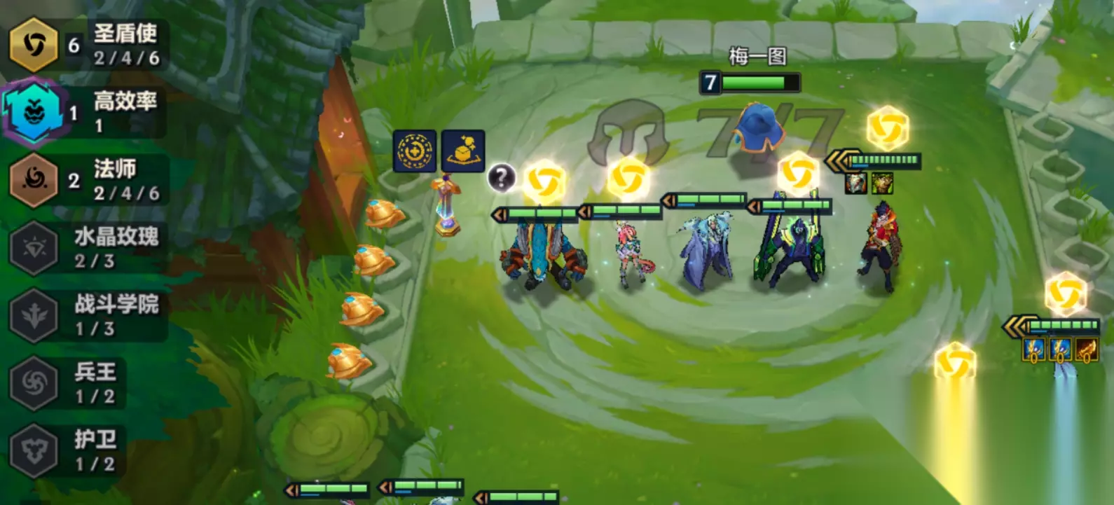 满足以上条件才可开玩,开局先看能不能凑出3水晶玫瑰的羁绊。有羁绊的话,可在升6启动前薅一波经济。只要保证风女带了核心装,那在3-5之前都能赢多输少。3-1或者3-2升6并启动后,开始D一波洛和二星风女。凑出4圣盾使2司令的羁绊,在此期间慢慢D三星的洛和风女。它俩中有一张升到三星,就能升7了。升7后如果碰到奎桑提,那6圣盾基本就稳了。