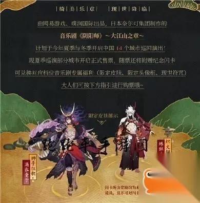 (好友馈赠功能将于6月12日维护后上线) ☆音乐剧限定式神皮肤、头像框☆ ▲阴阳师音乐剧购票将赠送游戏内限定皮肤:炼狱茨木童子・炽火钢躯、酒吞童子・狮子狂歌,以及限定头像框(静态与动态)等奖励。 ▲购票福利将以闪卡形式在演出现场进行发放,届时请大人们凭票领取对应档位闪卡。闪卡所含奖励为本次音乐剧专属限定道具,且不可对闪卡进行二次交易。 ▲票务预售将于今日(5月5日)10:00开始,请各位阴阳师大人留意。 ▲售票信息详询@阴阳师音乐剧
