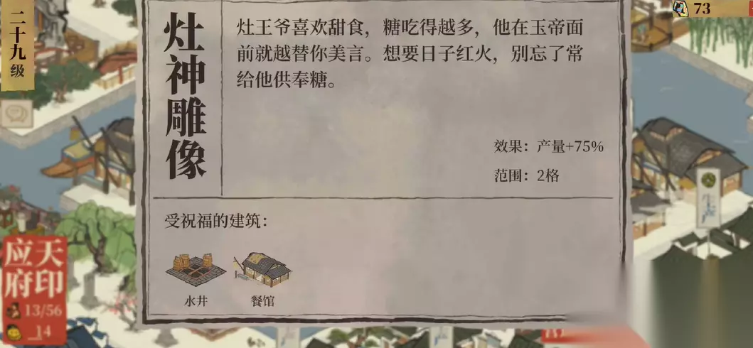 所谓的供奉灶王爷并非指玩家需要找到一个名为糖的道具进行点击供奉的独立操作,那仅仅是游戏内一个增加趣味性的背景故事描述。真正的供奉行为,其核心在于激活并利用灶神雕像的祝福效果,通过在其影响范围内建造特定生产建筑来持续获得收益,这个过程本身就是对灶王爷的供奉与回馈。