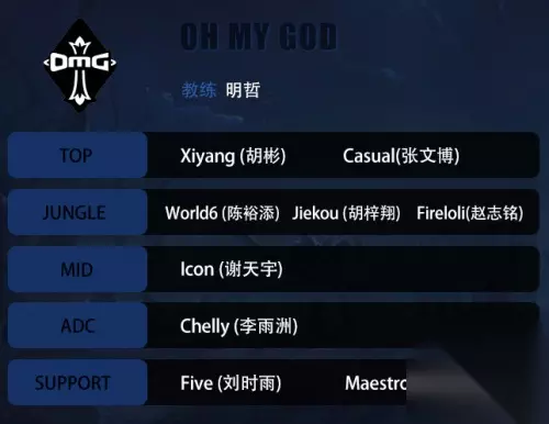 OMG大名单: 教练:明哲 上单:胡彬(Xiyang)、张文博(Casual) 打野:陈裕添(world6)、胡梓翔(jiekou)、赵志铭(Fireloli) 中单:谢天宇(ICON) 射手:李雨洲(Chelly) 辅助:刘时雨(Five)、胡建鑫(Maestro)