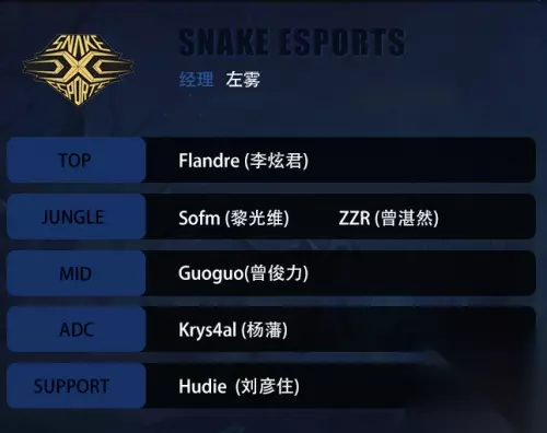 Snake大名单: 经理:左雾 上单:李炫君(Flandre) 打野:黎光维(Sofm)、曾湛然(Zzr) 中单:曾俊力(Guoguo) ADC:杨藩(kRYST4L) 辅助:刘彦住(Hudie)