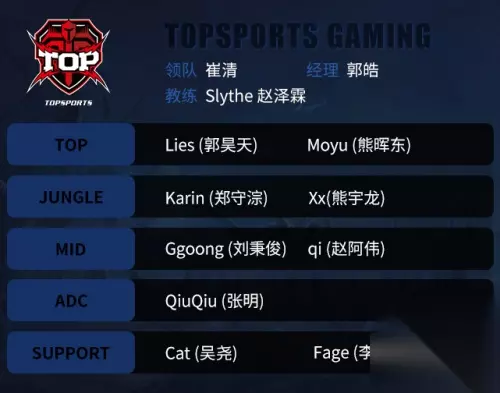 TOP大名单: 领队:崔清 经理:郭皓 教练:赵泽霖(Slythe) 上单:郭昊天(Lies)、熊晖东(Moyu) 打野:郑守淙(Karin)、熊宇龙(Xx) 中单:刘秉俊(Ggoong)、赵阿伟(qi) ADC:张明(QiuQiu) 辅助:吴尧(Cat)、李泽恩(Fage)