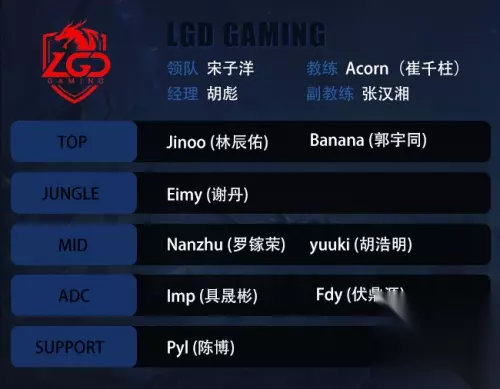 LGD大名单: 经理:胡彪(Bigbiao) 领队:宋子洋(Ziyang) 教练:崔千柱(Acorn) 副教练:张汉湘(DP) 上单:林辰佑(Jinoo)、郭宇同(Banana) 打野:谢丹(Eimy) 中单:胡浩明(Yuuki)、罗镓荣(Nanzhu) ADC:具晟彬(Imp)、付鼎源(Fdy) 辅助:陈博(Pyl)