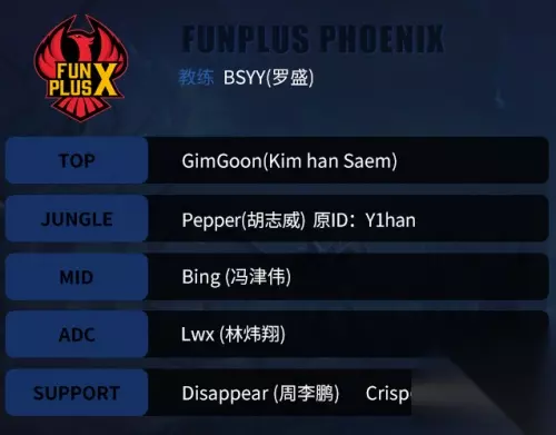 FPX大名单: 主教练:罗盛(BSYY) 上单:金韩泉(Gimgoon) 打野:胡志威(Pepper) 中单:津伟(bing) ADC:林炜翔(Lwx) 辅助:刘青松(Crisa)、周李鹏(Disappear)