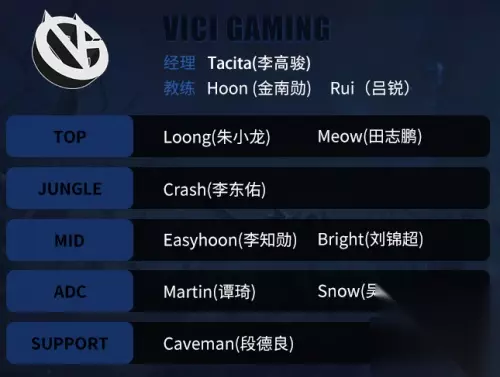 VG大名单: 上单:朱小龙(Loong)、田志鹏(Meow) 打野:李东佑(Crash) 中单:李知勋(Easyhoon)、刘锦超(Bright) ADC:谭琦(Martin)、吴好顺(Snow) 辅助:段德良(Caveman)