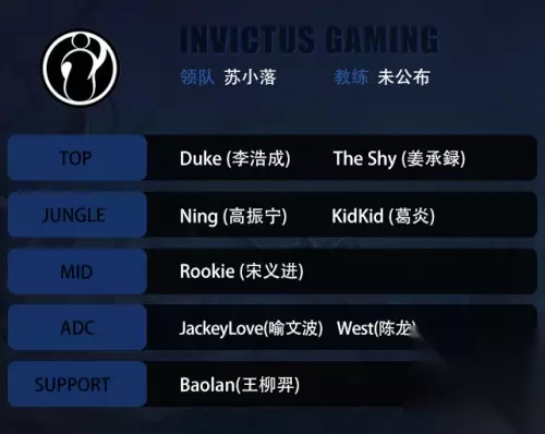 iG大名单: 上单:李浩成(Duke)、姜承録(Theshy) 打野:高振宁(Ning)、葛炎(kidkid) 中路:宋义进(Rookie) ADC:喻文波(JackeyLove)、陈龙(West) 辅助:王柳羿(Baolan)