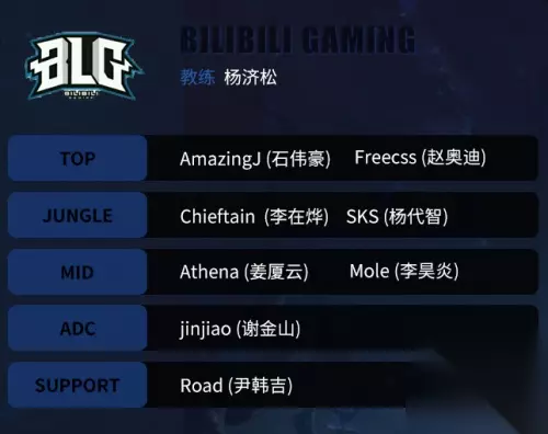 BLG大名单: 战队经理:余逸(Bge) 主教练:杨济松(Maokai) 上单:石伟豪(AmazingJ)、 赵奥迪(Freecss) 打野:杨代智(SKS)、李在烨(Chieftain) 中单:姜厦云(Athena)、李昊炎(Mole) ADC:谢金山(Jinjiao) 辅助:尹韩吉(Road)