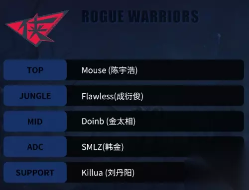 RW大名单: 教练:周律希(Steak) 上单:陈宇浩(Mouse) 打野:成衍俊(Flawless) 中路:金太相)(Doinb) 下路:(韩金(SMLZ) 辅助:刘丹阳(Killua)