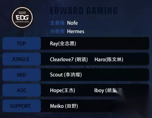 EDG大名单: 主教练:NoFe 分析师:Hermes 上单:全志愿(Ray) 打野:明凯(Clearlove7)、陈文林(Haro) 中单:李汭璨(Scout) ADC:王杰(iBoy)、胡显昭(Hope) 辅助:田野(Meiko)