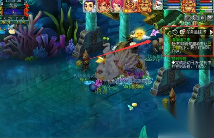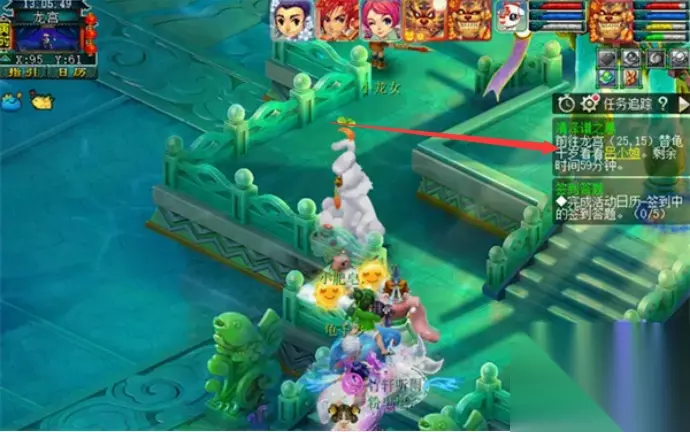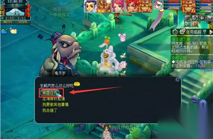 2、接取任务之后,要前往龙宫,先去寻找龟千岁对话。 3、再去找吕小娘进行交互,这里会给我们5个烹饪。 有几率可以要到绿芦羹和红罗羹。