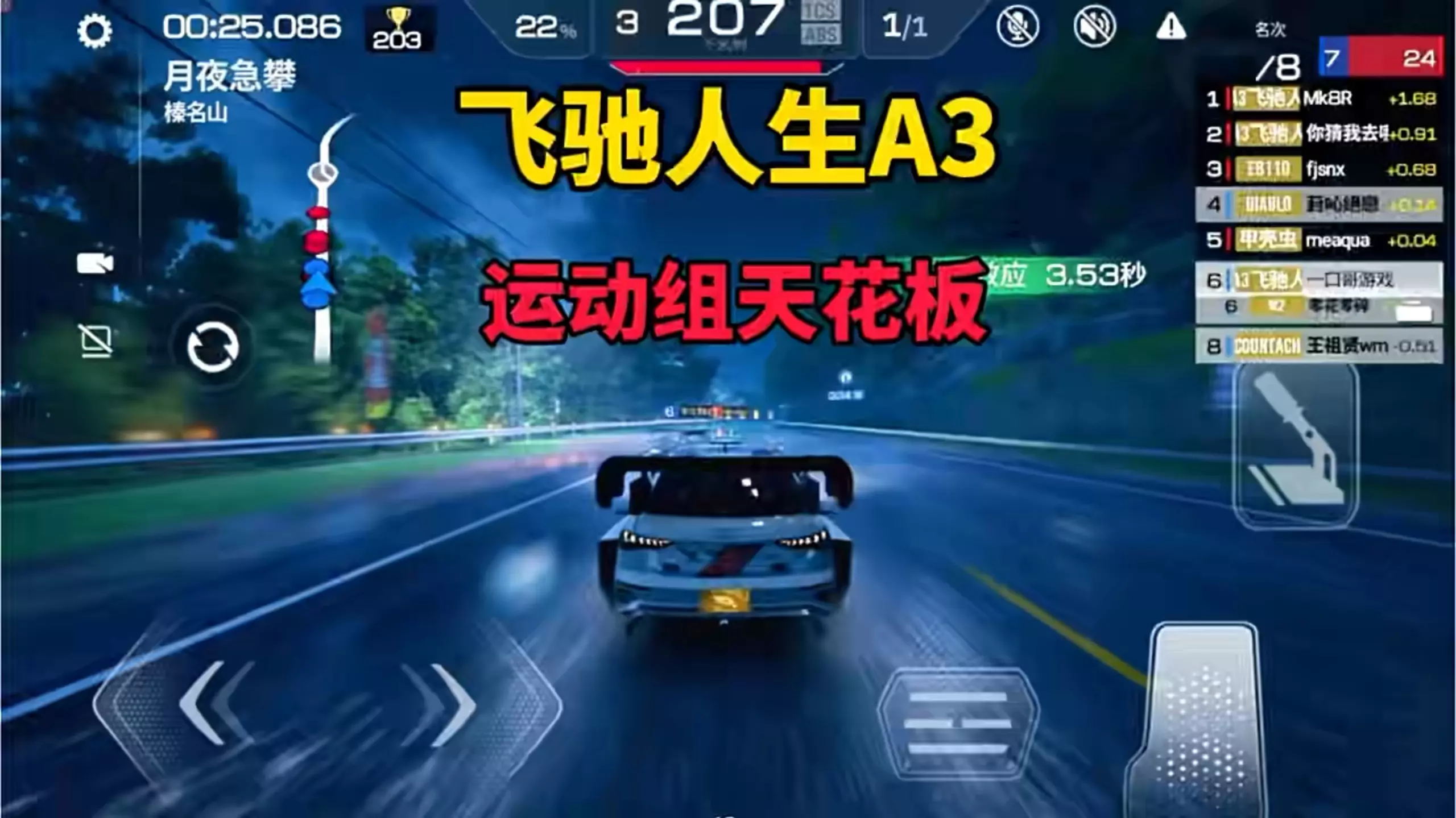 这是《巅峰极速》的游戏解说,解说者称飞驰人生A3是游戏里运动组的天花板级别车辆,在榛名山月夜急攀赛道的对局中,该车展现出强劲的赛道表现,能和曾经的运动组天王车型抗衡。