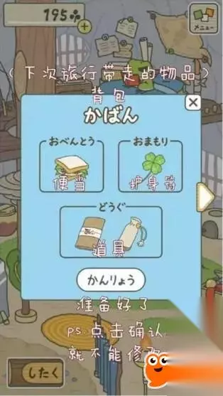商店有便当和道具卖,玩家可以用三叶草购买。不同的便当也道具价格不一样,不同的便当和道具组合在一起,也会决定了你的青蛙儿子每次旅行地点和遭遇的不同。