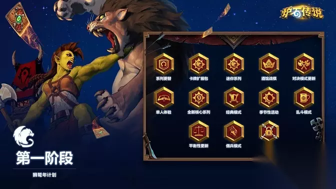 【狮鹫年计划一览】 空中的巨大炉石时钟又一次向前走了一格!感谢大家与我们共度了凤凰年。今天公布的“贫瘠之地的锤炼”标志着《炉石传说》新一年第一阶段的开始——而这新的一年就是狮鹫年!