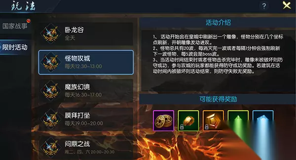 怪物攻城 一、玩家等级达到30级时,家可以参与怪物活动;活动开启时,通过右上角图标、活动-限时活动可参与该活动。