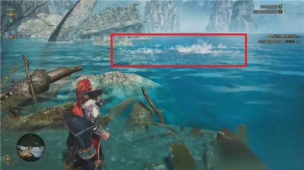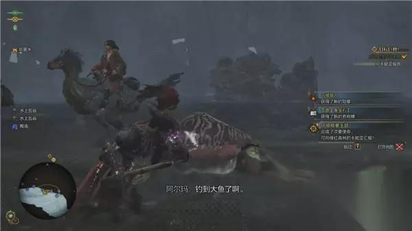 3.钓鱼环境与特殊情况 任何天气下,湖面都会随机出现翻腾的水花。阿尔玛会提示:“水花飞溅的地方有鱼群。” 在这些位置使用任何钓饵均可钓鱼,有概率钓到普通鱼或大鱼。 湖面特殊现象: 飞龙:可用钩索驱赶。 废料:可用钩索移除。 极端天气(如暴雨、雷暴)时,大鱼的出现场率显著提高,尤其是巨大乌贼(入道乌贼)。 钓大鱼技巧 1.选择鱼饵并抛竿。 2.引诱大鱼咬钩:若未上钩,可根据按键提示使用荡竿动作吸引大鱼。 3.控竿收线: 大鱼上钩后,顺着鱼游动的方向移动钓竿(左摇杆/WAD键)。 当鱼力竭时,交替上-下扳动左摇杆收线(PC端交替按W/S键)。此时猎人会有明显挑竿的动作。 重复3-4次,直到大鱼靠岸,即可成功钓起。
