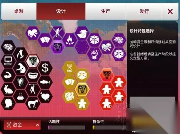 打开桌游界面,可以发现病原体的传染性、严重性和致命性已经被桌游的“话题性”“复杂性”“适用性”代替,其中话题性类似病原体的传染性,适用性类似病原体的致命性,复杂性emmmm。。。具体是什么我也不知道,但总之和严重性一点也不像。 游戏流程分为三个阶段:设计、生产、发行,只有进行完前一个阶段之后,去下一个阶段内解锁,才能进入下一个阶段,并且前一个阶段会被锁定无法再次进行。 当选好公司驻地之后,就可以开始投身设计你的桌游了。设计分为四部分:主题,机制,组件,人数。 每添加一个元素,将来就可以为桌游带来话题性和复杂性,并且所有的设计元素全部不用资金,可以完全按照个人喜好添加。另外,设计阶段的元素是复杂性的唯一来源,一旦结束设计,复杂性就不会再变动。